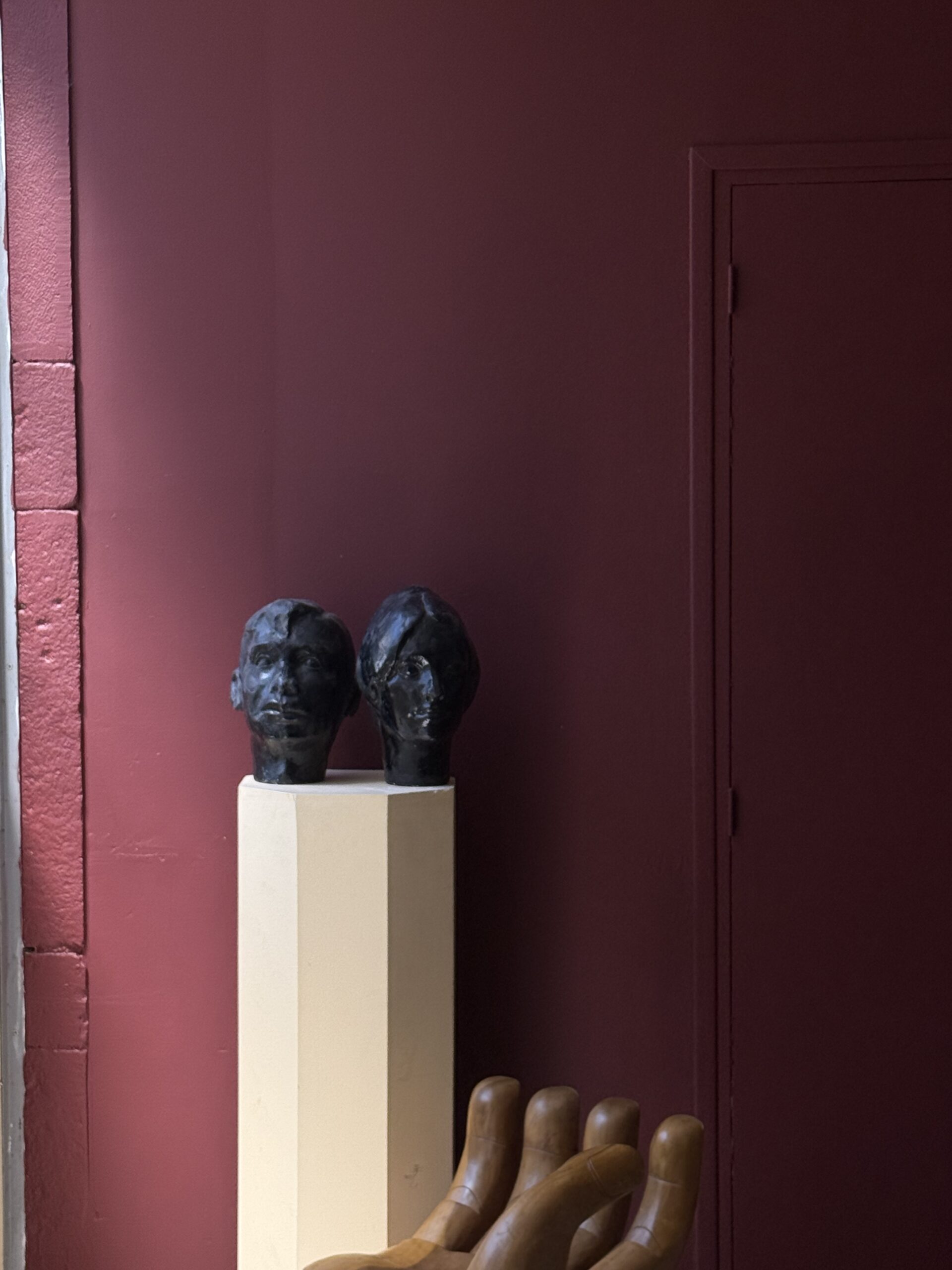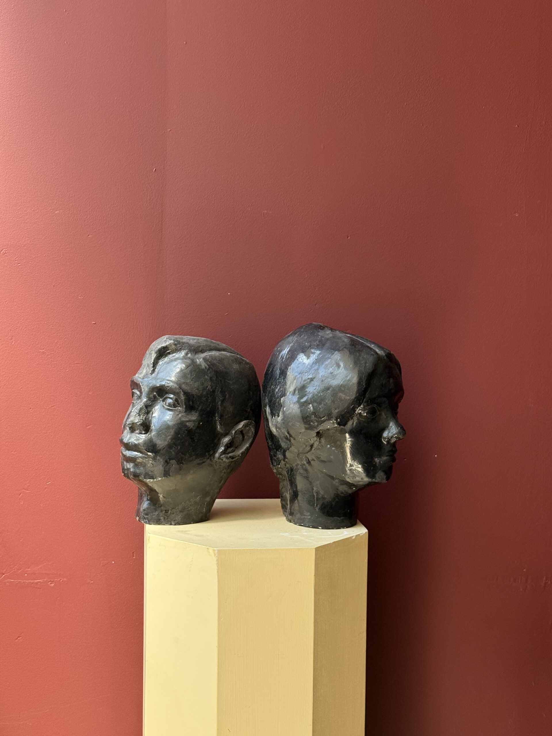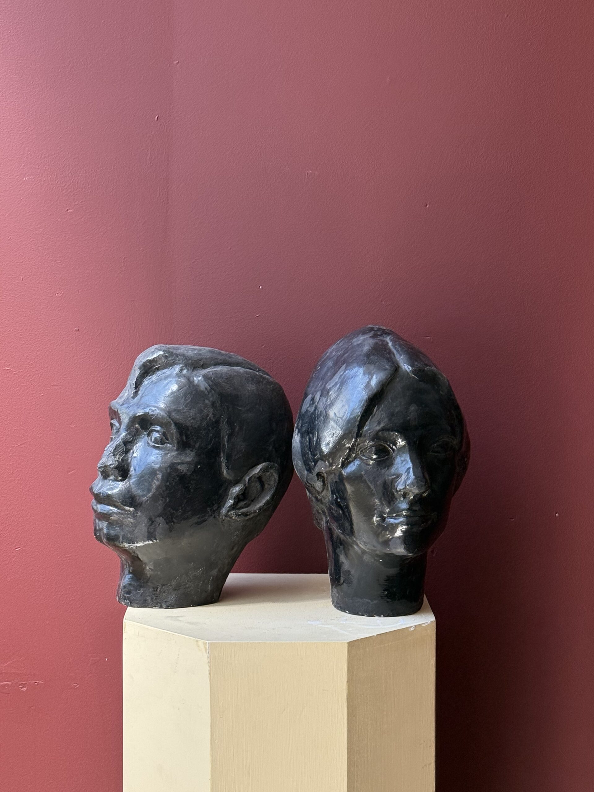 Couple de bustes en plâtre peint, signés « VIDAL ». Hauteur : 42 cm.