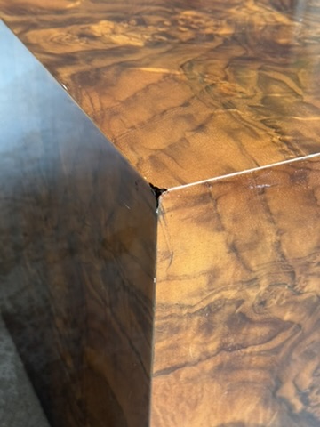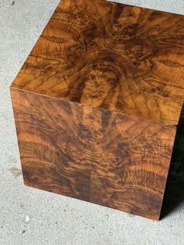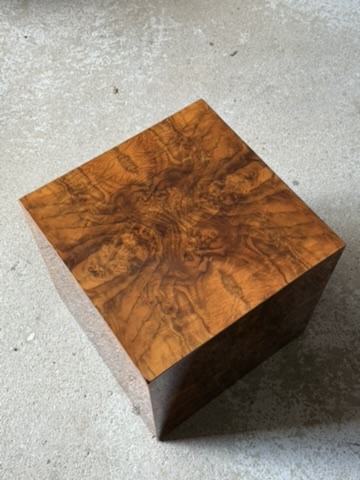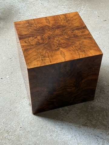 Cube en placage de loupe d’orme, 44 cm de coté. Bon état général, usures aux coins, cf photos de détail.