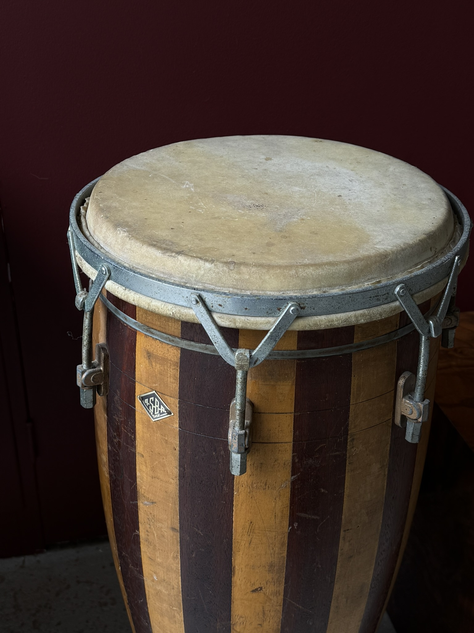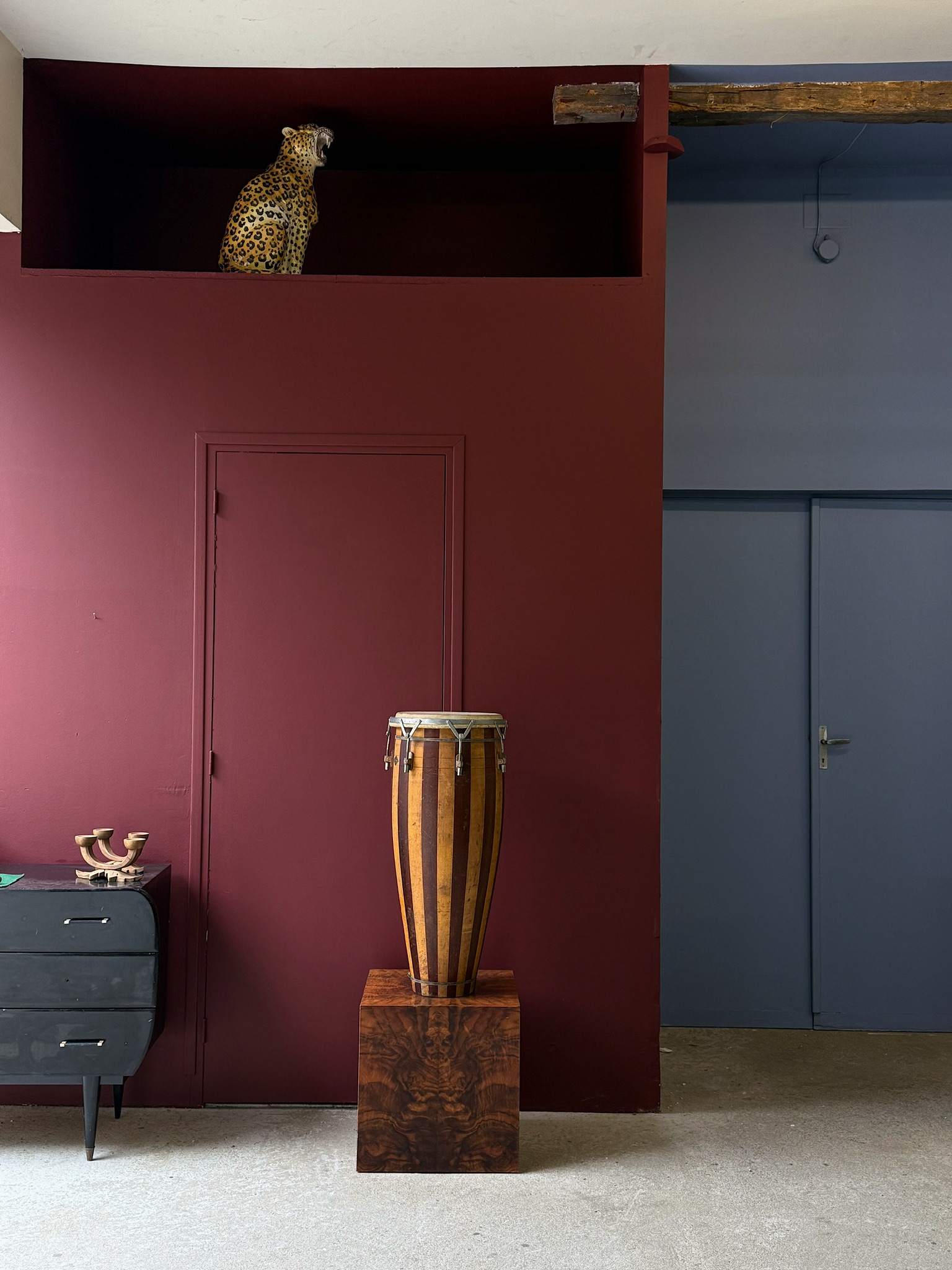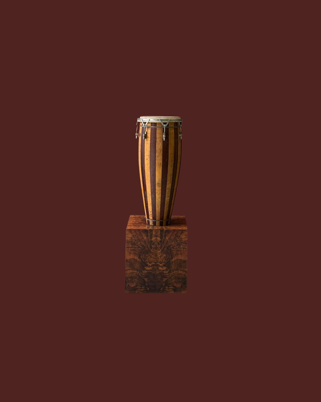 Grand tambour ancien, pouvant faire office de sellette. Hauteur : 80 cm.