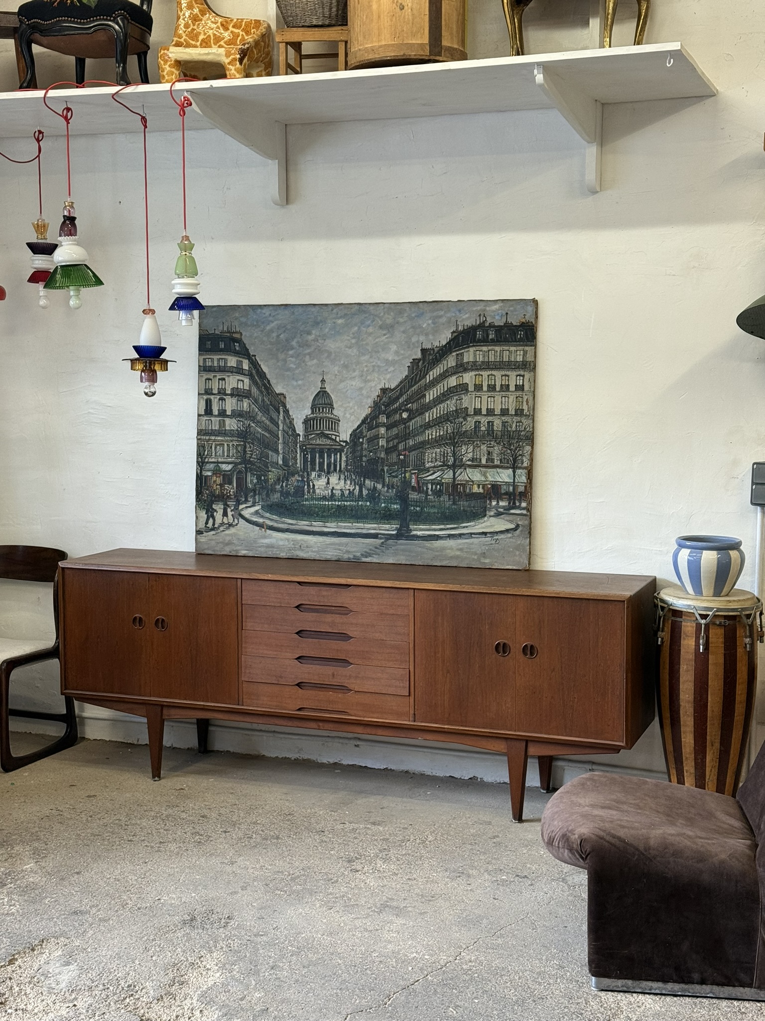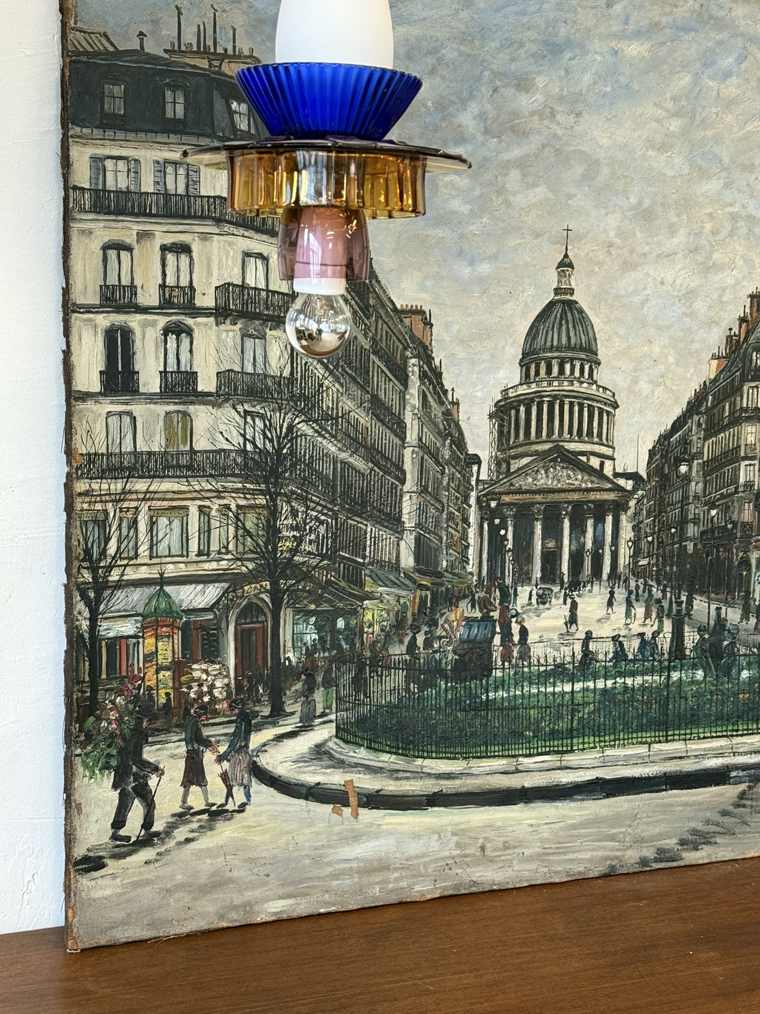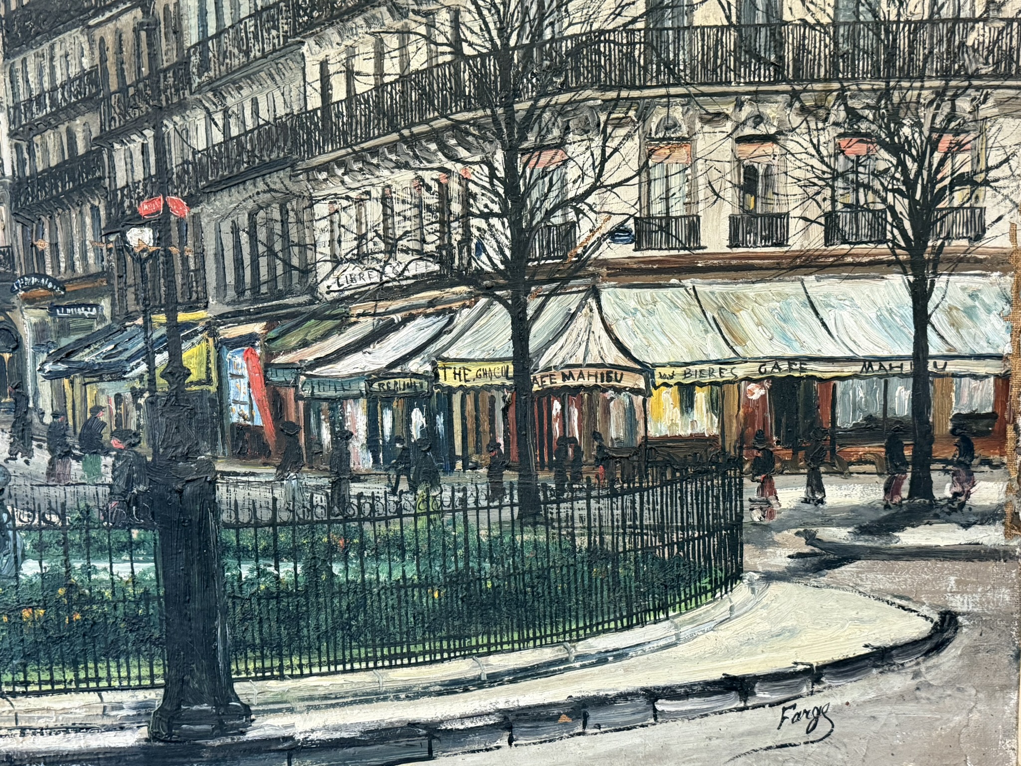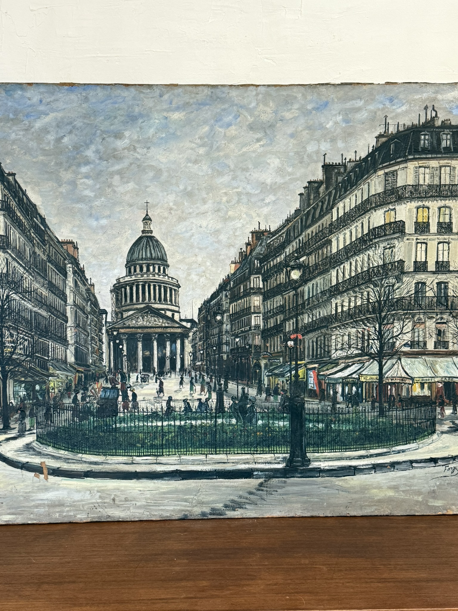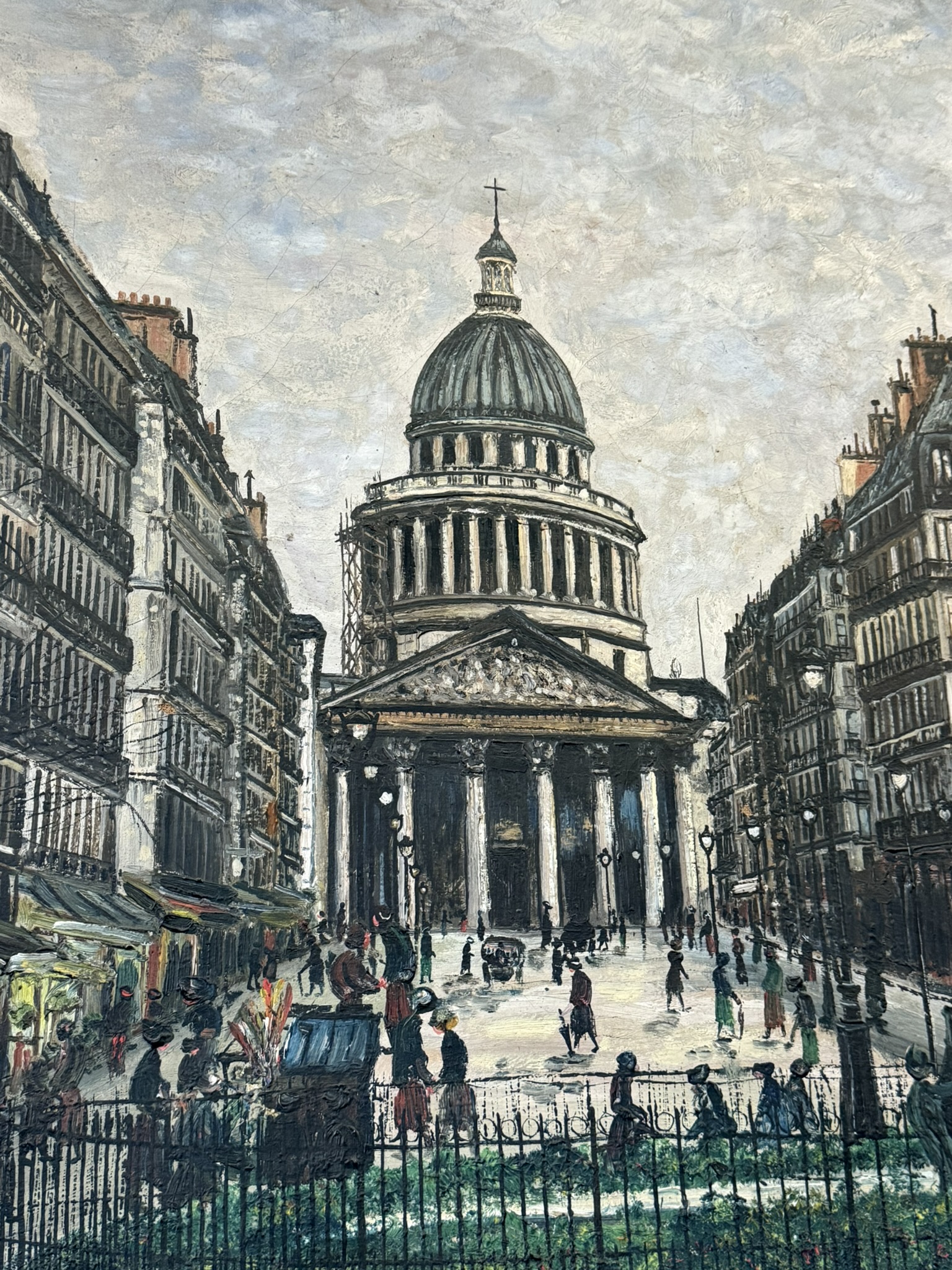 Belle scène de vie parisienne du début du XXè s., sur la place du Panthéon à Paris. Quelques manques de peinture cf photos de détail. Huile sur toile. Dimensions : 98 x 136 cm.