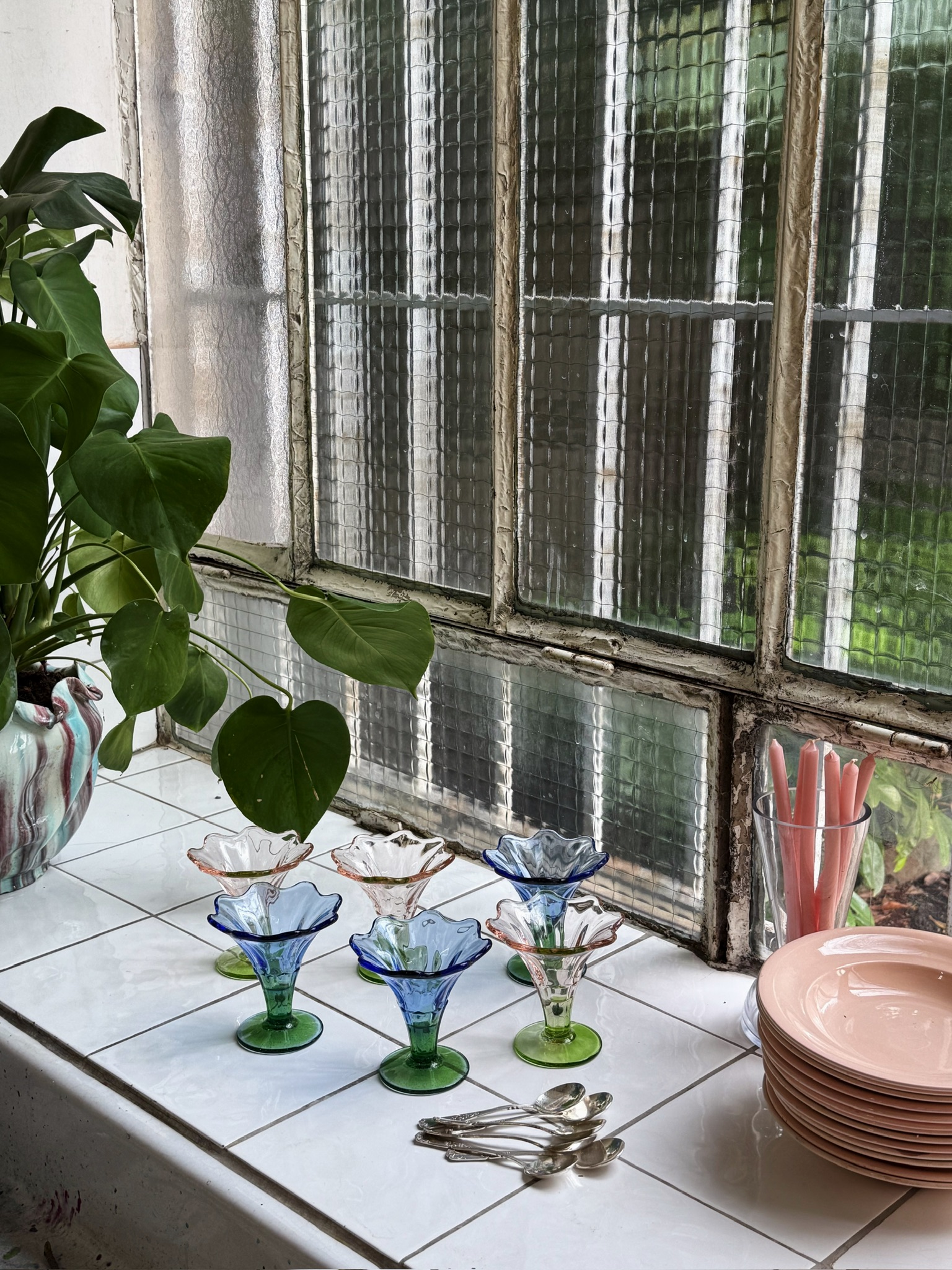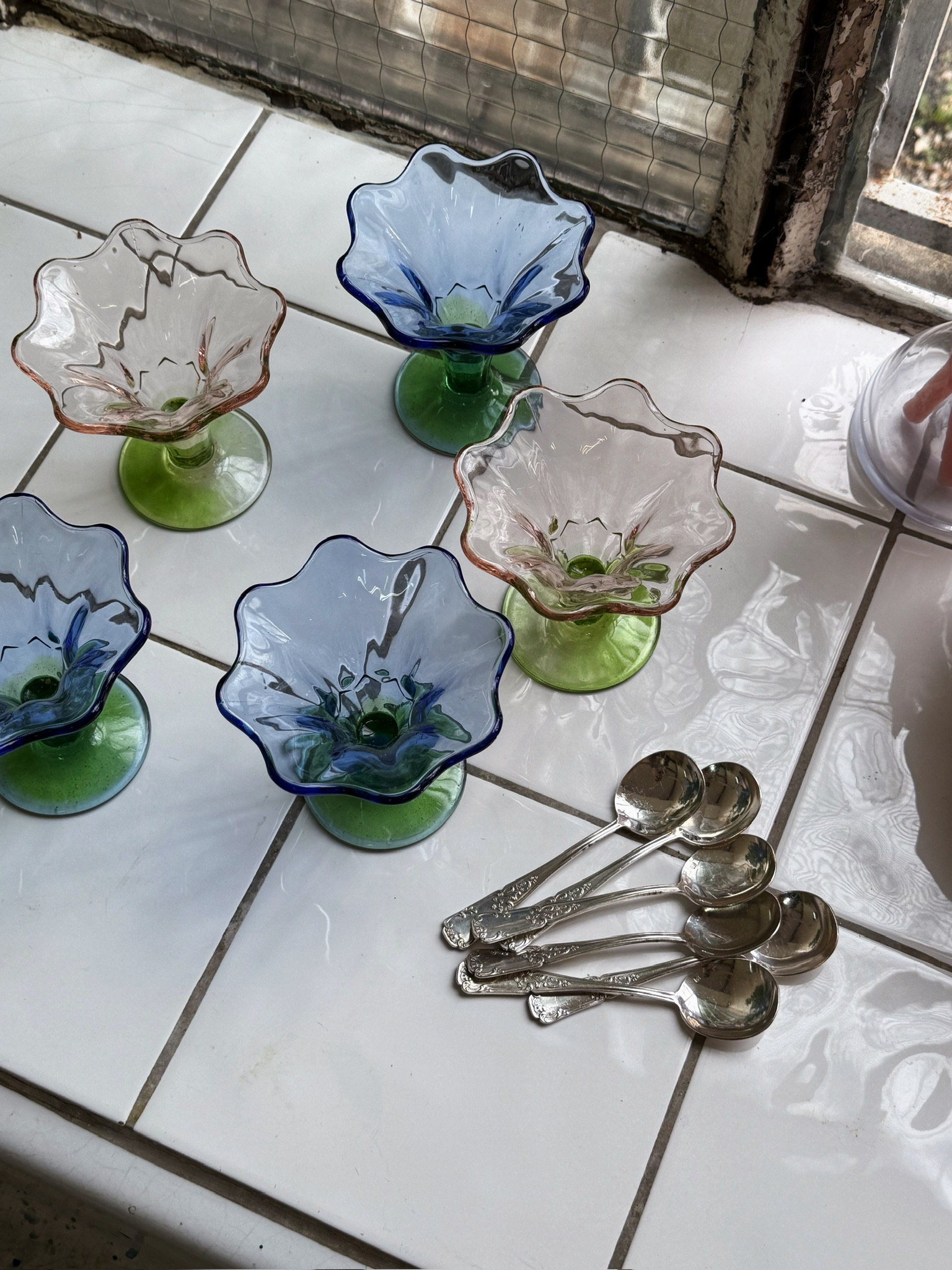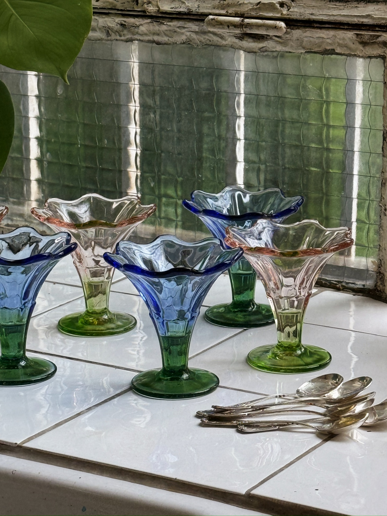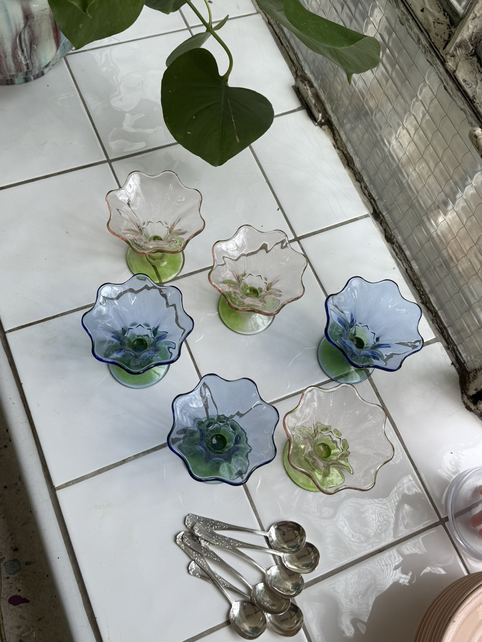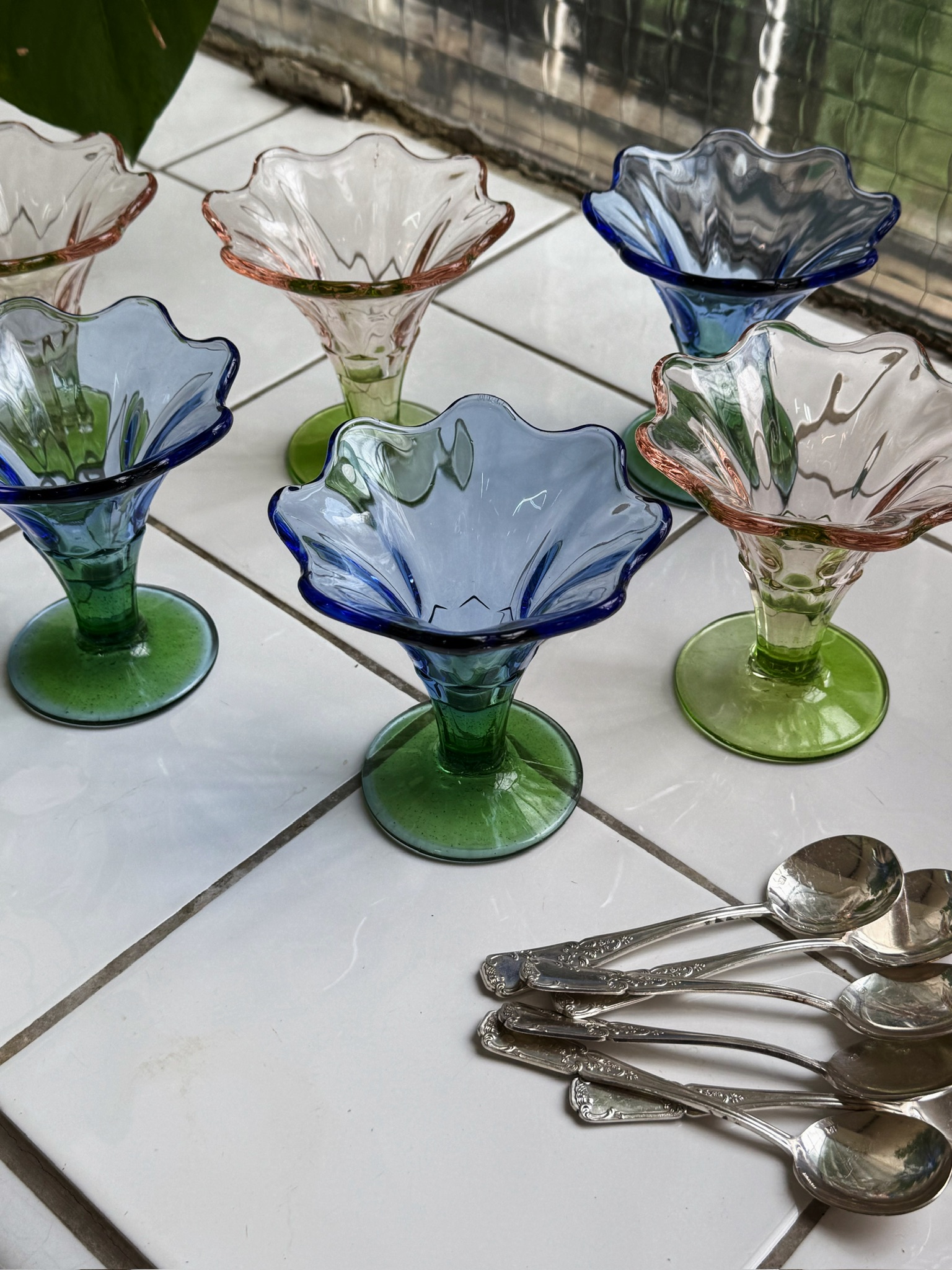 Série de six coupes à glace en verre pressé-moulé, en forme de fleurs. Trois roses et trois bleues. En parfait état.