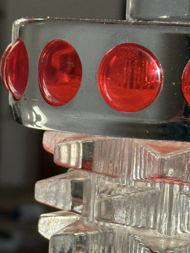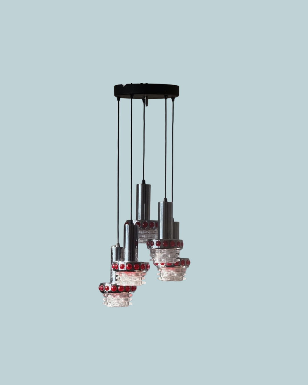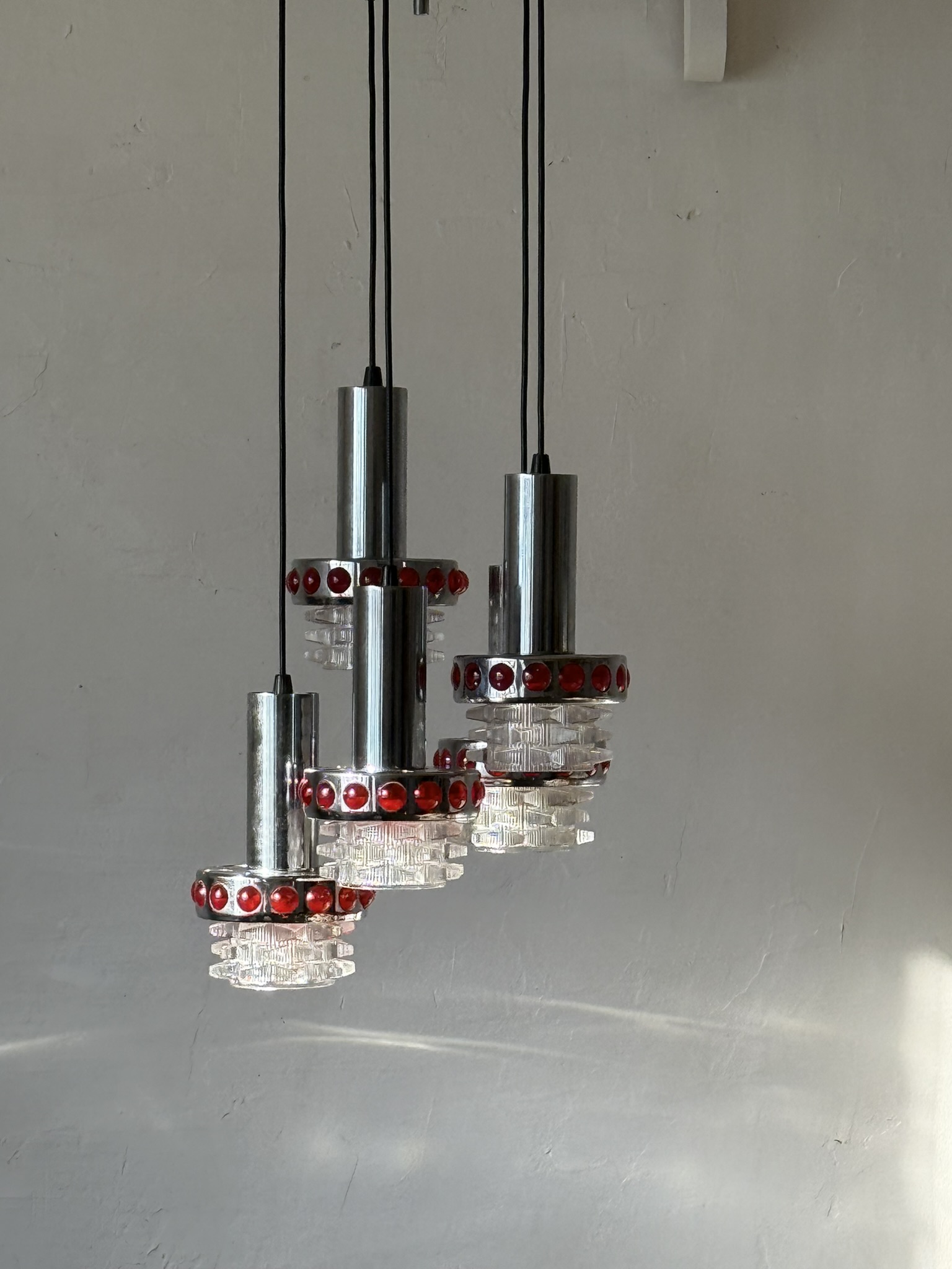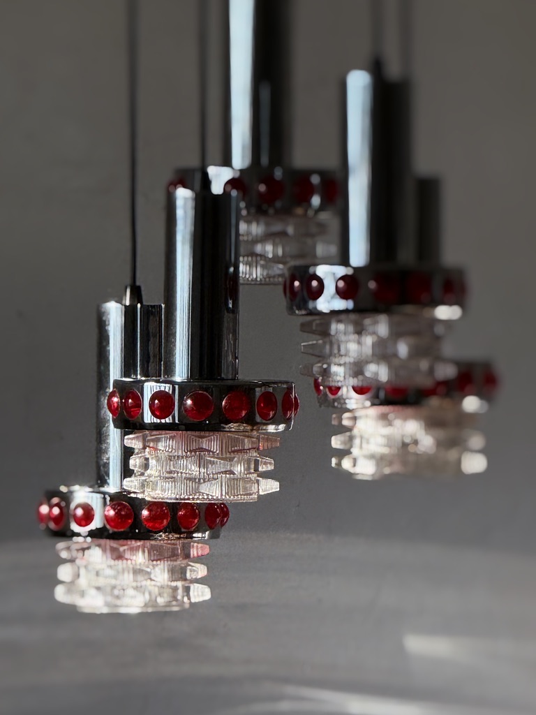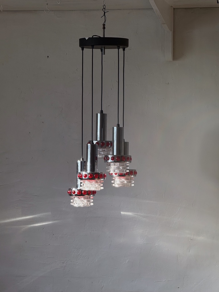 Suspension RAAK période années 70, Space Age. Cinq feux de lumière, électricité ok. Métal chromé, cabochons en plastique, tulipes en verre. Parfait état.